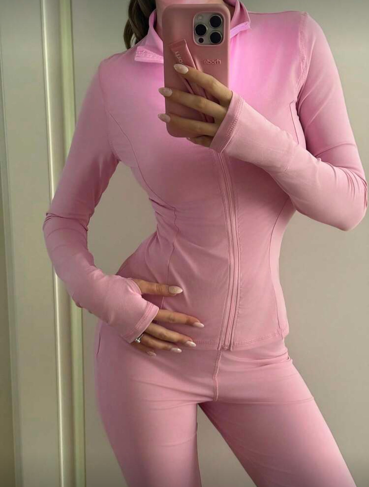 Achieve your fitness goals in style with our Pink Athleisure Set. The slim fitting long sleeve top with a convenient zipper pairs perfectly with the flare pants for a flattering and comfortable workout outfit. Ideal for exercising and practicing Pilates, this set will keep you looking and feeling great.