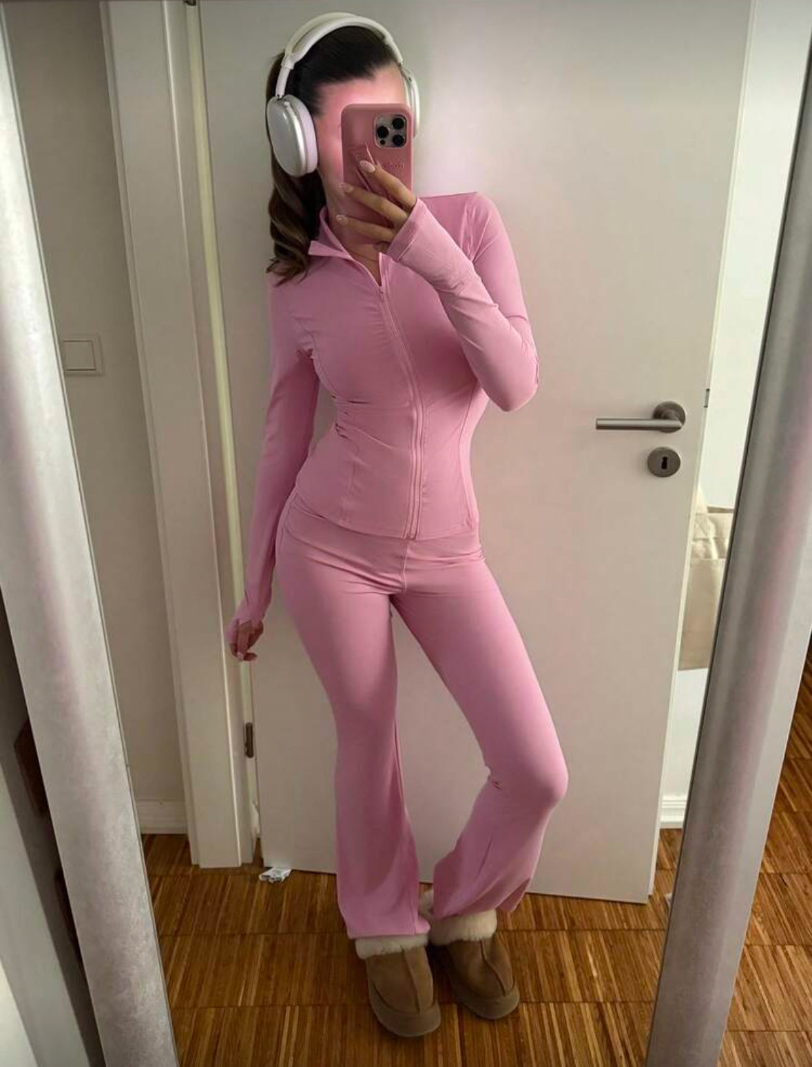 PINK ATHLEISURE SET LONG SLEEVE ZIP TOP WITH FLARE PANTS