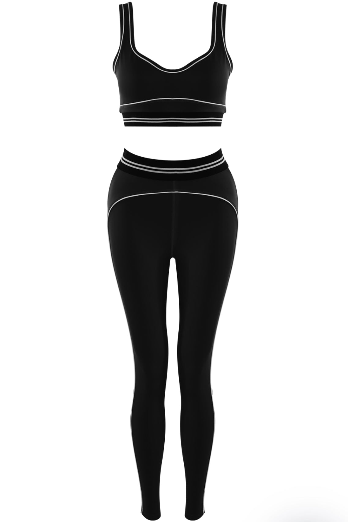 BLACK WHITE CONTRAST STRIPE GYM CROP TOP LEGGINGS SET