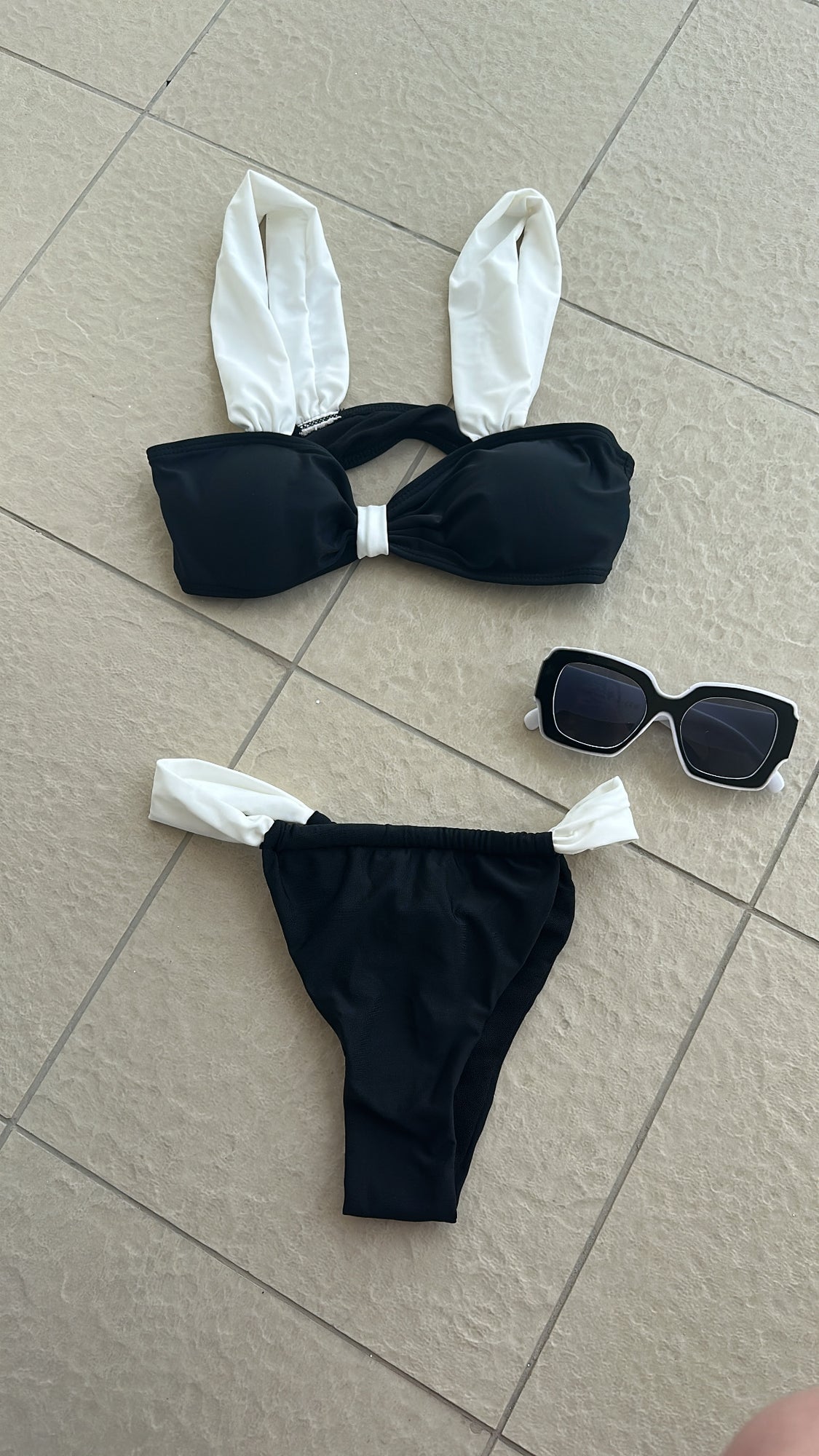 BLACK AND WHITE CONTRAST RUFFLE BIKINI SET